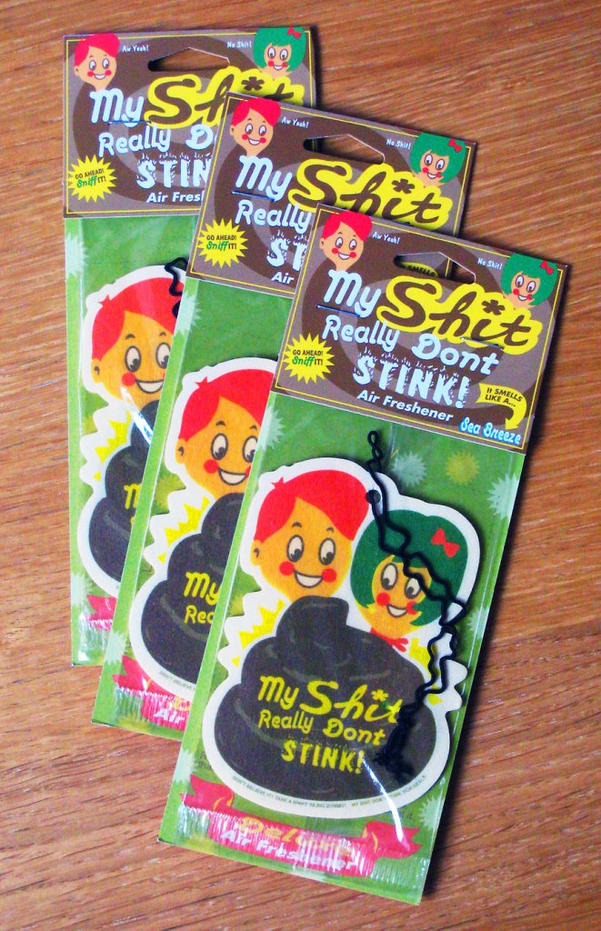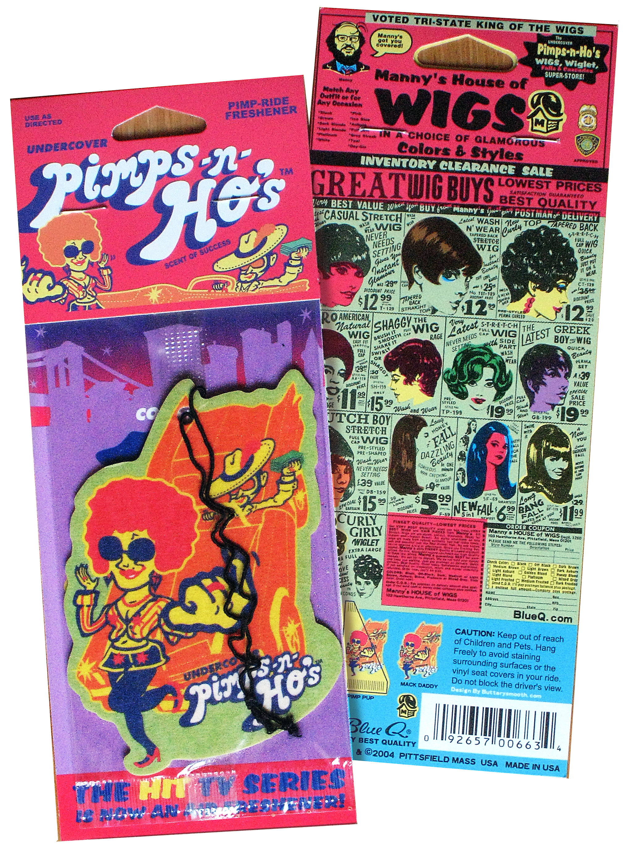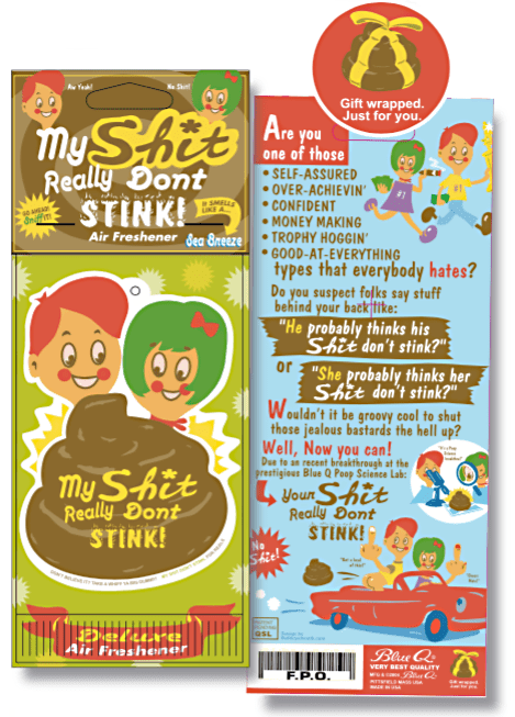 Fully functional CAR AIR FRESHENERS. Its about time those PINE TREE air fresheners got a refresh. Leave it to Blue Q. The VIRTUAL FUZZY DICE® air freshener advertised a virtual scent, and I got Blue Q to get the factory to run this one without any scent. This is the one that hangs in my ride cuz my car don’t stink! Speaking of… If you scroll all the way down you’ll find the MUD FLAP LADY ONLINE® & The MY SHIT REALLY DON”T STINK® air fresheners. MY SHIT® has a back-side design with a boy flipping the bird and projectile pooping– likely a first in most retails shops around the country. I”m particularly proud of my puns per product quotient on MUD FLAP LADY®. DISCLAIMER: the PIMPS-n-HO’s® concept was my wife Sarah Sockit’s (“Cops Cops by day, Pimps n Ho”s by night!”)