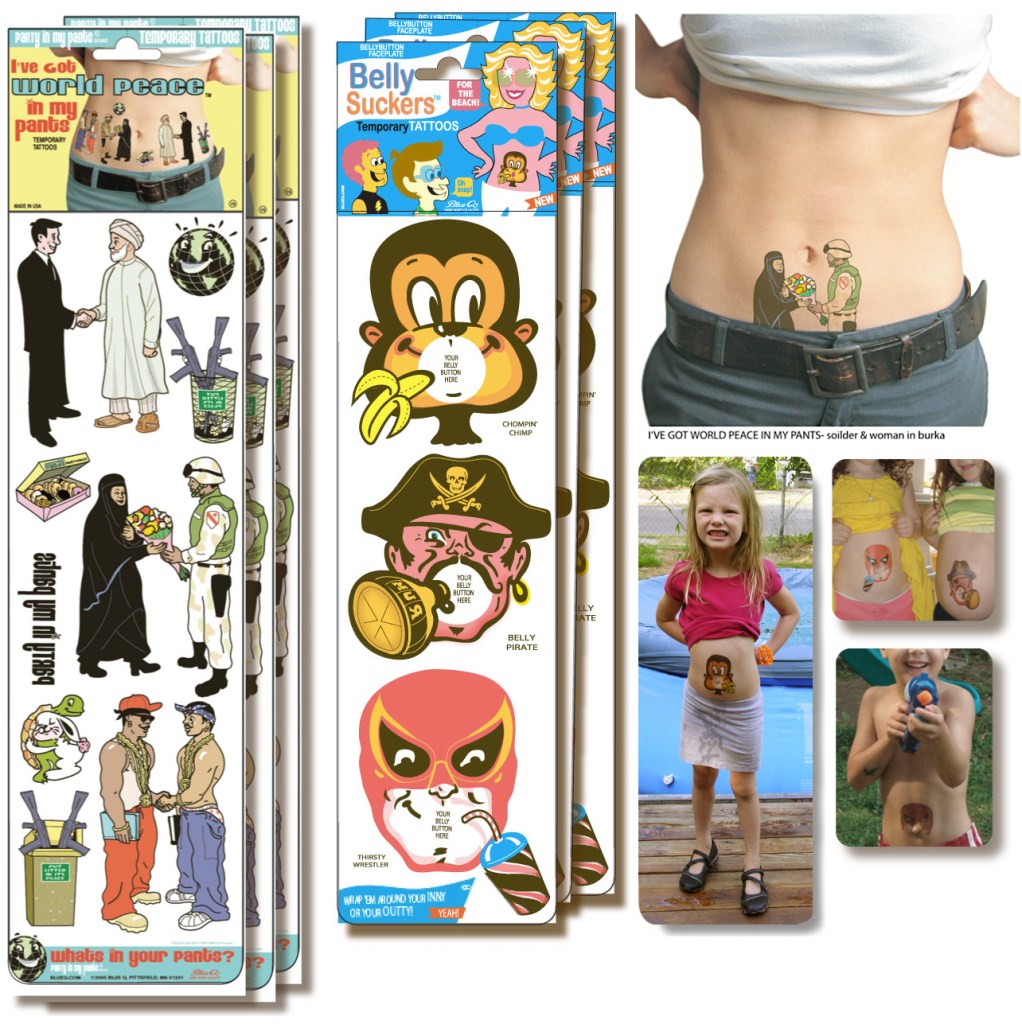 Blue Q’s TEMPORARY TATTOOS My goal was to create tats for acreage on the body rarely harvested for ink: the belly. Sure, Tupac’s belly tat did start a revolution near the belly button, but strictly for the wanna-be gangsta set. The I’VE GOT WORLD PEACE IN MY PANTS® temp tat set offers everyone the opportunity to tuck some good vibes into their pants. • BELLY SUCKERS® Turns out kids really dig a Thirsty Pirate hoisting a bottle of rum to their navel.