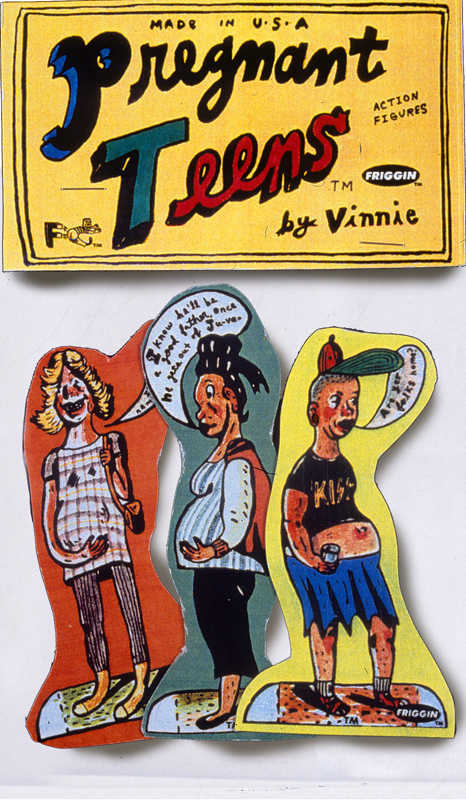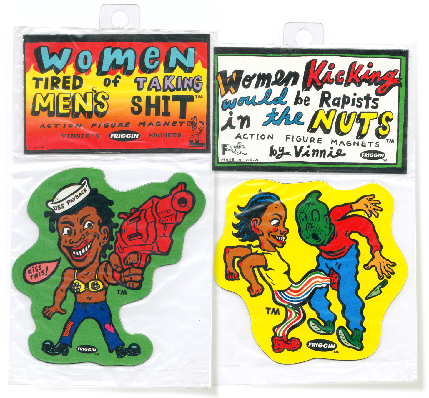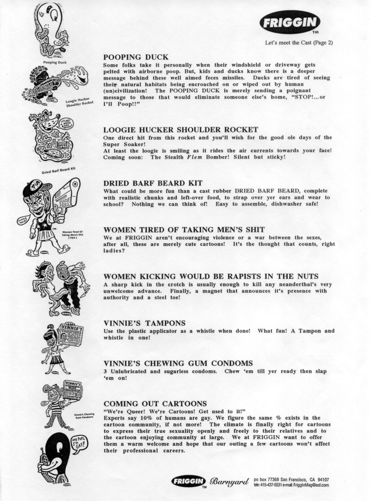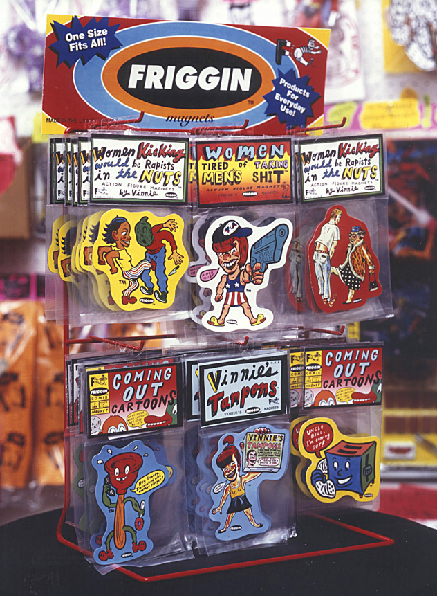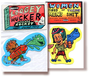 The first two sets were MY LOCAL STREET GANG® and PREGNANT TEENS® -These first two sets were clearly not ready for prime time retail, but I felt obligated to start the ball rolling. I decided to make the colors of MY LOCAL STREET GANG® green & yellow so as to not engage the local turf war. Note: this was 1994, four years before David Gonzales came out with his genius HOMIES® line of plastic figurines loosely based on Chicano culture and sold in vending machines. The response among my friends was positive and the magnetic sheeting was oddly satisfying to cut with scissors so I kept the groove going. The first series of what I now called FRIGGIN MAGNETS® included POT SMOKING TEENS ON HOPPITY HORSES®, HONEST COPS®, WOMEN KICKING WOULD BE RAPISTS IN THE NUTS® and WOMEN TIRED OF TAKING MEN’S SHIT. Not long after I partnered with LA artist Marcy Freedman to expand the FRIGGIN line with the hopes of landing the FRIGS into stores. We started by weeding out the sets that seemed least likely to make it onto any store shelves (PREG TEENS, LOCAL STREET GANG, POT SMOKING TEENS), but the thought that any of the sets would be welcomed with a warm embrace spotlighted our naiveté about the retail market. To our credit, we did land the FRIGS in Urban Outfitters and into a decent list of stores across the US and Japan, but pushing magnets with any political underpinning was a serious uphill battle- no matter how cute the gay plunger is.