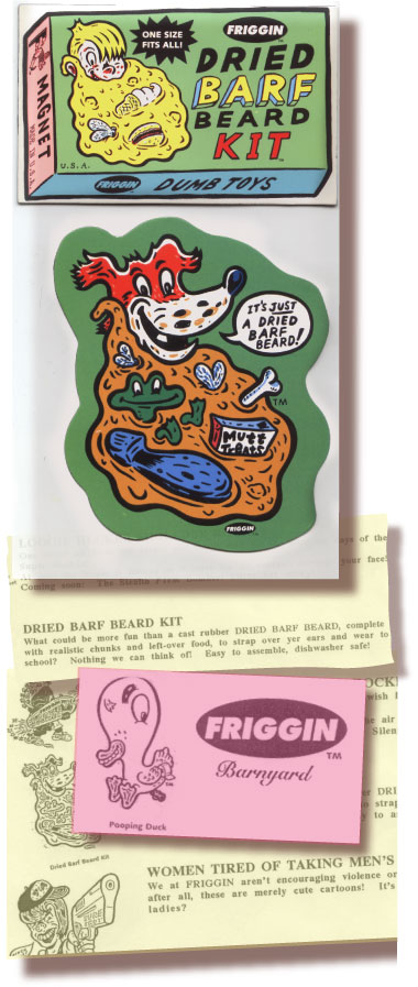 Meet a few of the cast: • MR. POOP IN-A-BOX®: “I stink!” announces MR. POOP as he pops out of the box! “Sure you stink”, we remind him, “Yer MR.POOP. Yer supposed to stink!” Nuff said. • DRIED BARF BEARD KIT®: What could be more fun than a cast rubber DRIED BARF BEARD, complete with realistic chunks and left-over food, to strap over your ears and to wear to school? Nothing we can think of! Easy to assemble, dishwasher safe!