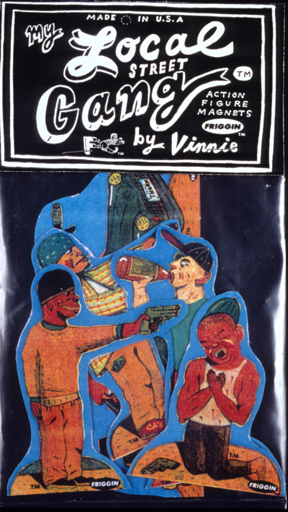 My first attempt were cut-out cardboard Crips gang members, about the size of the traditional plastic army figurines. I painted them, put them in a velo bag, added a decorative label and showed ‘em to my brother Gus. Gus liked them but said their weakness was that they didn’t do anything. Plastic figurines at least stand up and can be staged around a couch. Gus suggested making them into fridge magnets I had remembered a friend telling me about the guy who invented MAGNETIC POETRY having friends come over and cut words out for his sample sets using sticky-back magnet material. With a little research I found a magnetic sheeting company in town and was able to buy industrial size rolls of 4mm adhesive magnet material. I made color copies of MY LOCAL STREET GANG® characters and adhered to the magnet material. Then, with a pair of regular house scissors I cut carefully around the shape and- blam! a magnetic cottage industry was born.