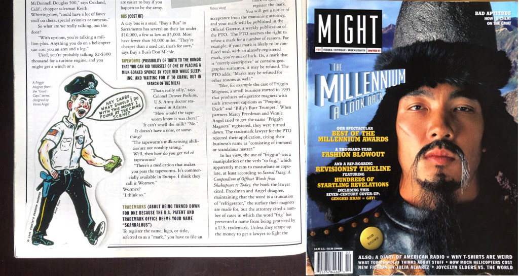 • HONEST COPS® (set of 3): “Hey Sarge, what should I do with this money I found at the crime scene?” This series didn’t make the cut for the final FRIGGIN line, but it was nonetheless featured in Might Magazine® (Dave Egger’s monthly precursor to McSweeny’s). The MIGHT article profiled the absurdist challenge my project partner (Marcy Freedman) and I had in our attempts to trademark the name FRIGGIN®. Ultimately, we did.