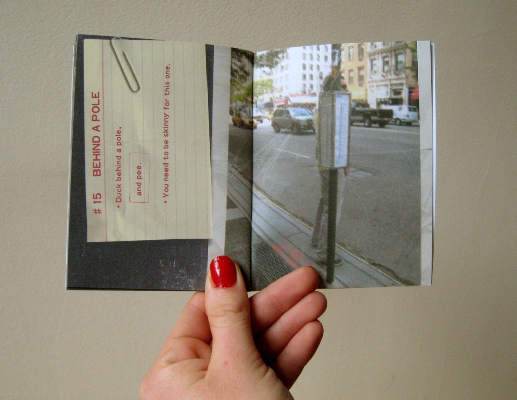 It’s tough to find a public restroom in the city but who says you need one? Ray Tempus teaches us to think outside the lavatory with his pocket sized urban survival guide. Tricks and tips for both genders. A redesign of Ray’s invaluable city guide. Ray’s original book was elegantly lo-fi, right down to the anatomically correct stick figures. BLUE Q, ever the realists, thought photos of actual pee running along the cracks of city sidewalks would better clarify the various methods. So, I enlisted a group of experienced volunteers and hit the streets. My design concept was to create a book that had the well-worn feel of a anthropologist/flasher’s research field guide,… the working manual of an anti-social loner type who doesn’t wash his hands after he pees… ever. Thus, the distressed pages, the type-written note cards, the tape holding the volume together, all tinted with a yellow-ish haze. Some of the options are really helpful!