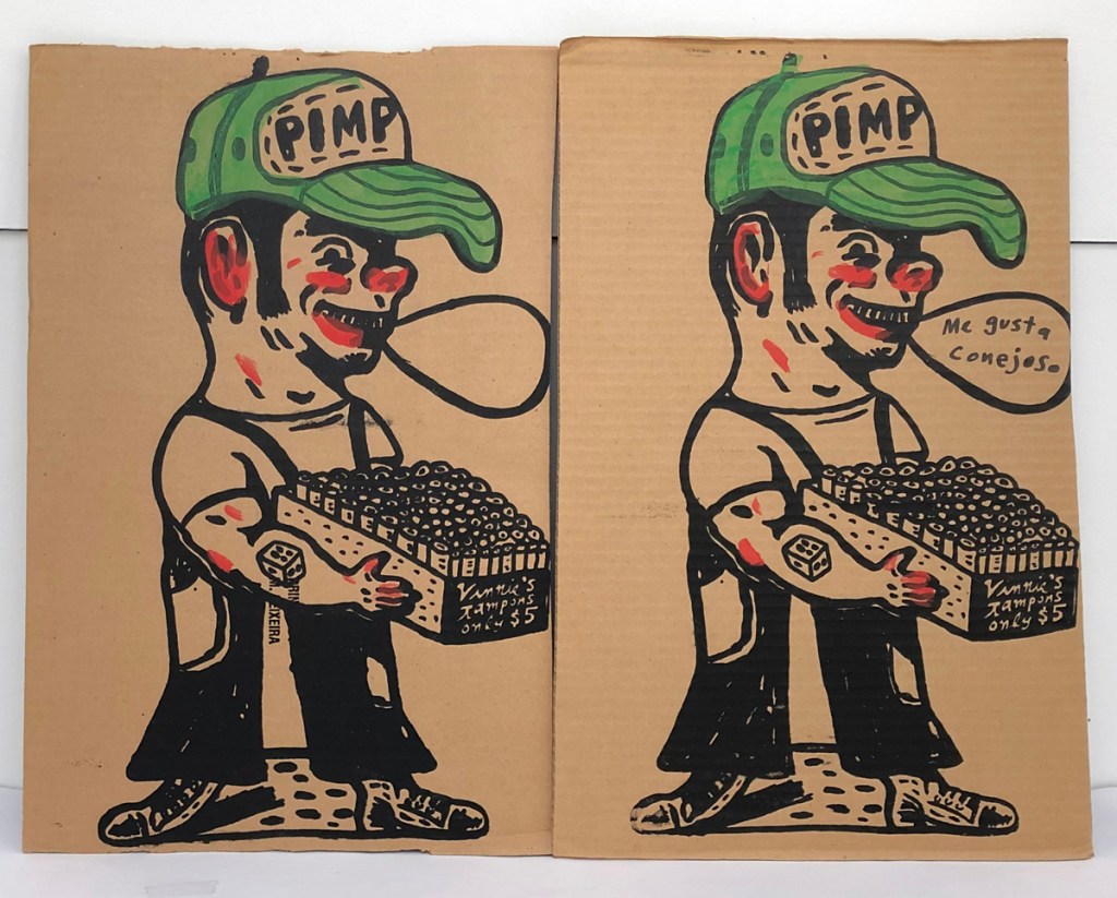These were unlimited editions of silkscreened cardboard characters designed to free-stand on a sidewalk (in mild to no wind). The vended wares depicted were typically of the illegal-but-ubiquitous variety– though, by no means accidental or unintentional cogs in our capitalist wheels of steady progress. The one I put out the most was the All-American “drugs” vendor: a red-cheeked white boy sporting a star-spangled sweatshirt and grinning ear to ear. And why shouldn’t he be smiling? White Americans continue to represent the primary demand for the illegal drugs that flood across our borders. Natch.